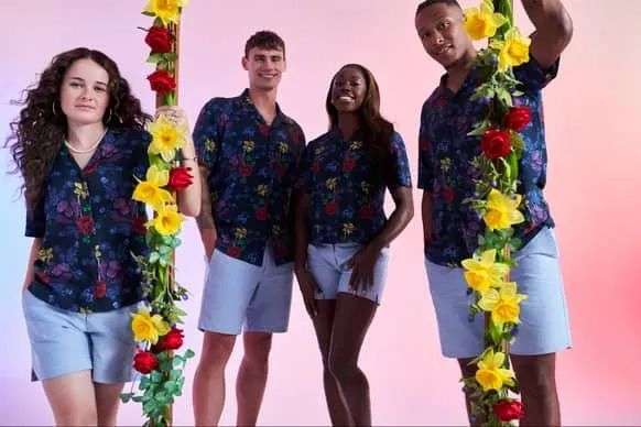 而闭幕式运动员制服展示了一件印有四国花卉图案的花卉衬衫,搭配牛津短裤,完美融合了四国的特色与时尚元素。