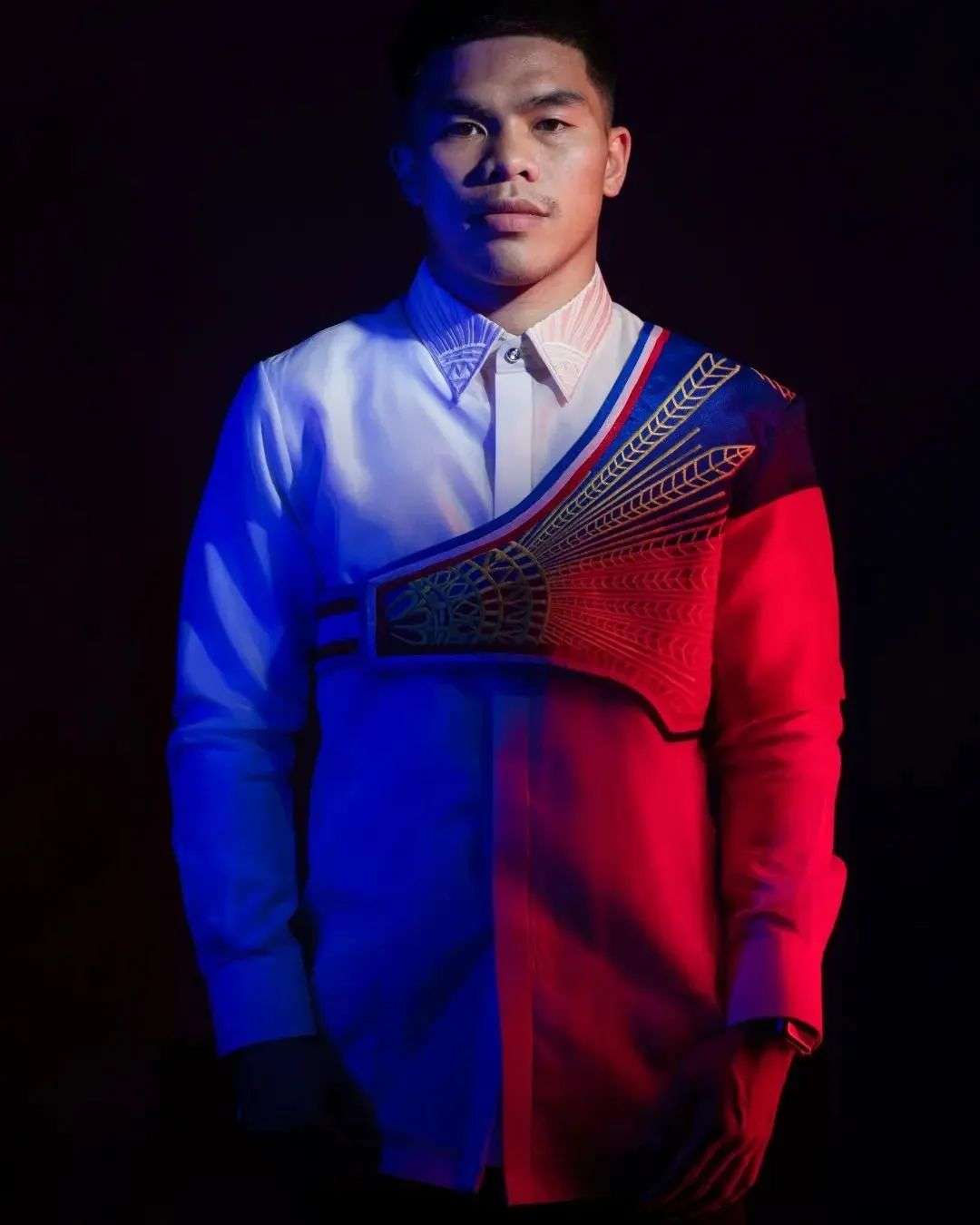 他采用了sinag barong,这是一种正式的轻便衬衫,并在其身上融入了蓝色和红色的三角形元素,呼应菲律宾国旗,同时在领口上绣有受Pintados战士图案和太阳光芒启发的设计。