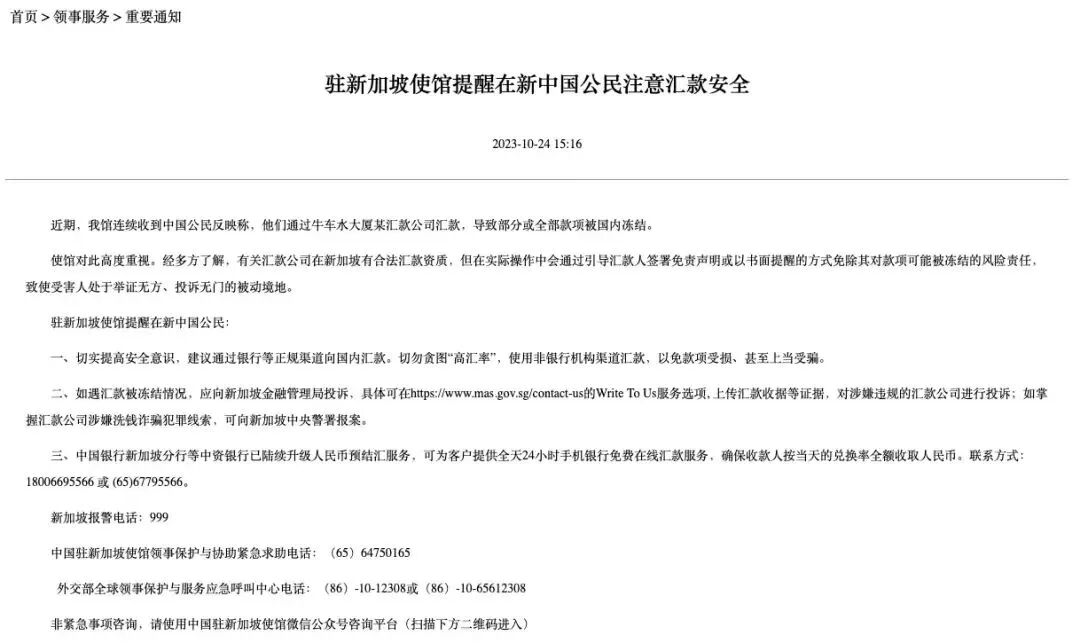 近期,中国驻新加坡大使馆发布了一则紧急公告: