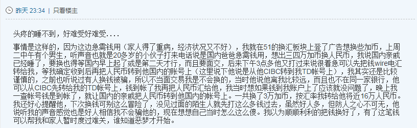 还有华人网友在加拿大某论坛上,爆料了自己换汇被骗的全过程,这位网友是由于家人患病急用钱,才想到了换汇,不料$3万加币全被骗走!
