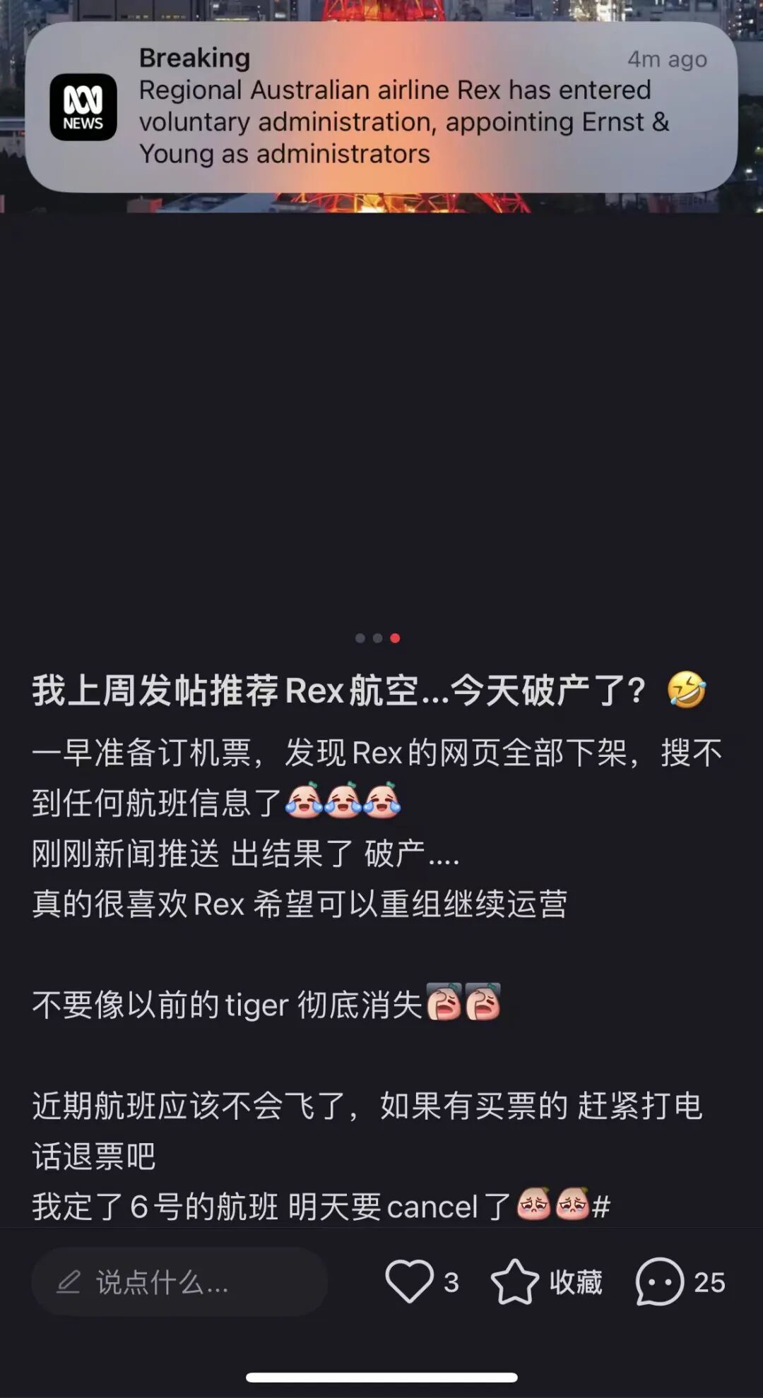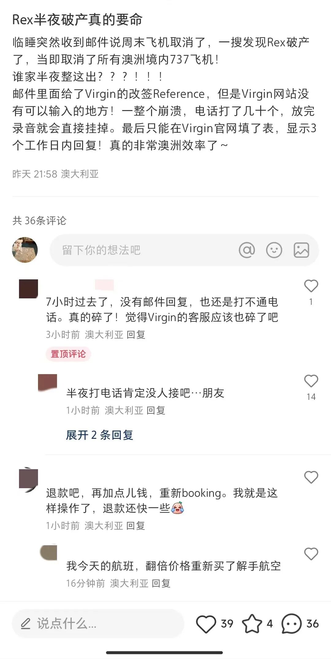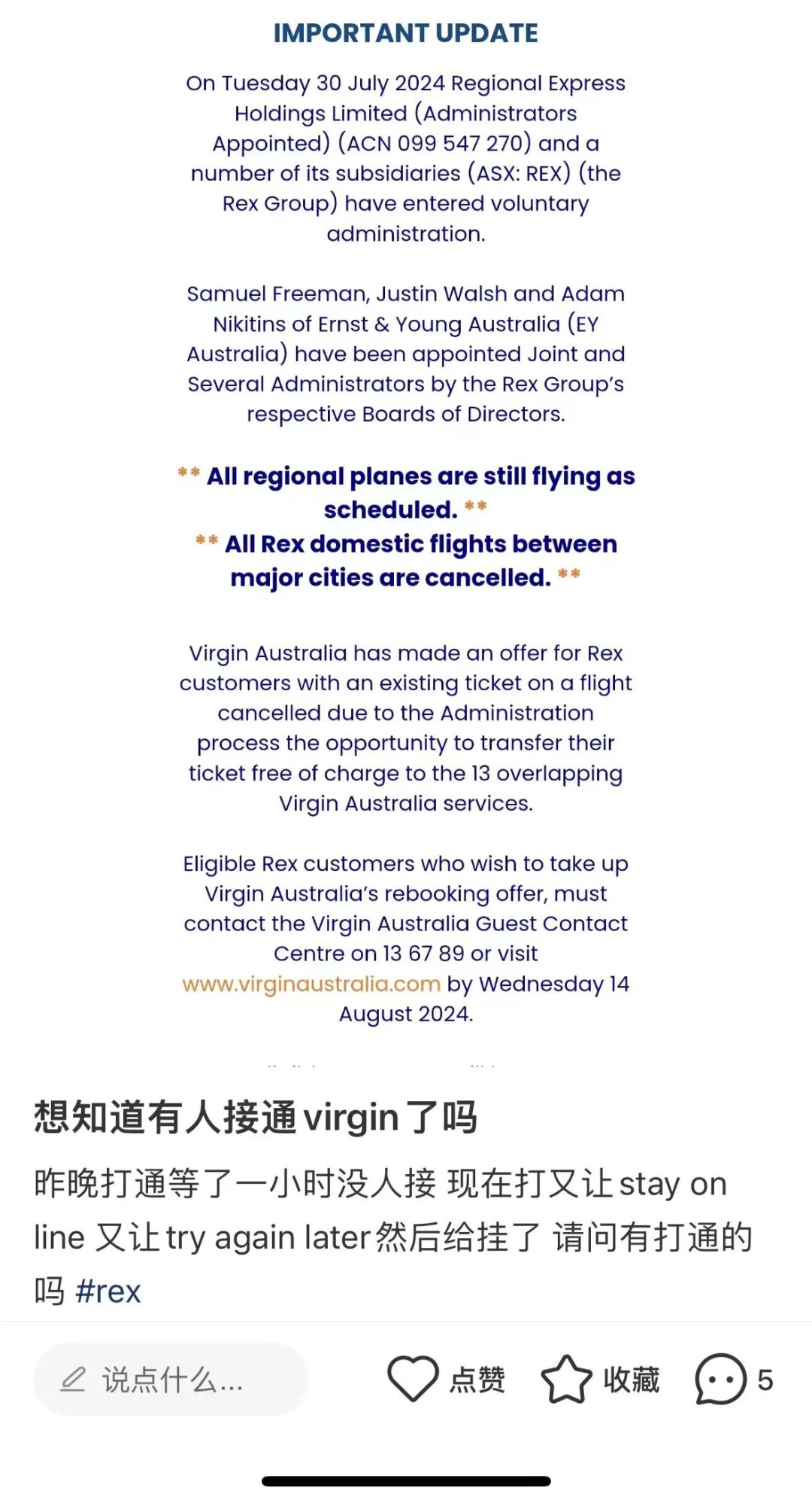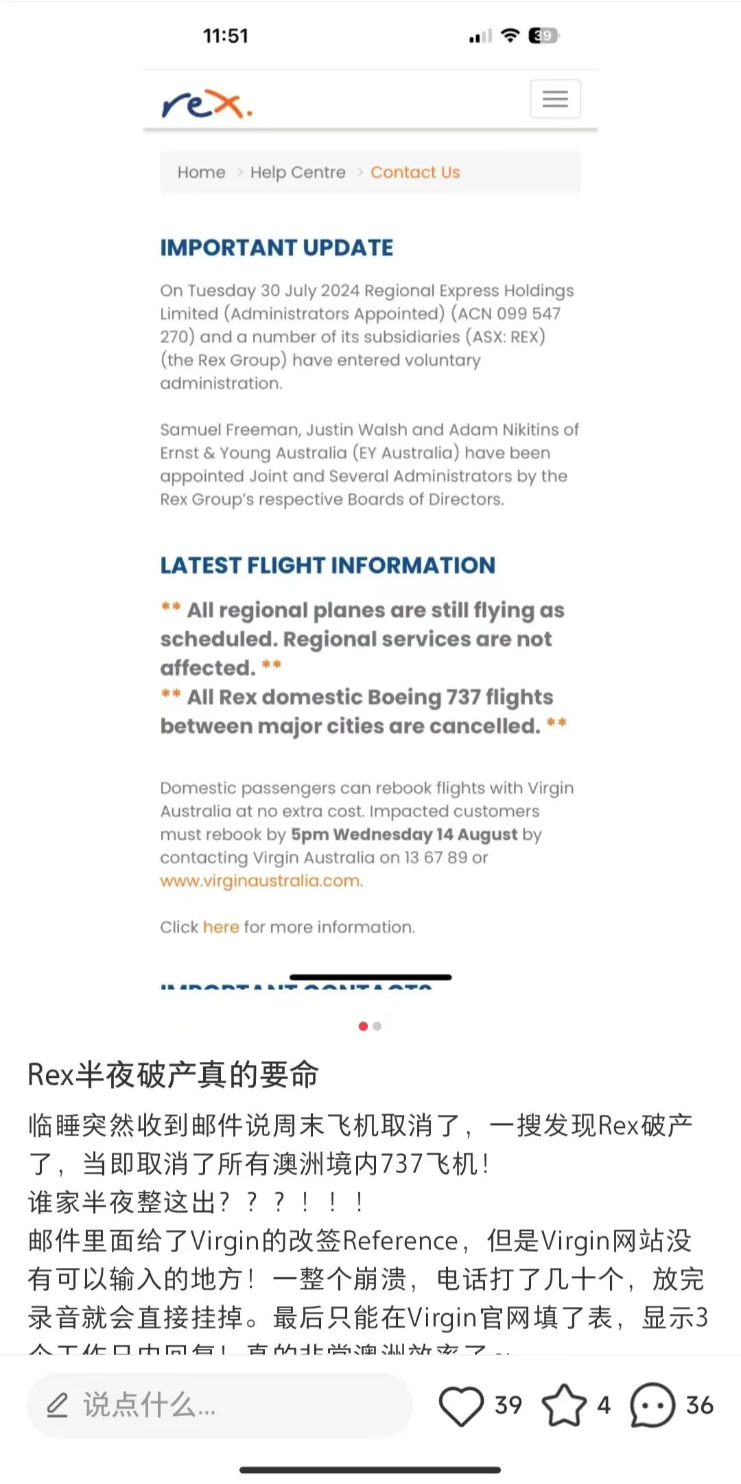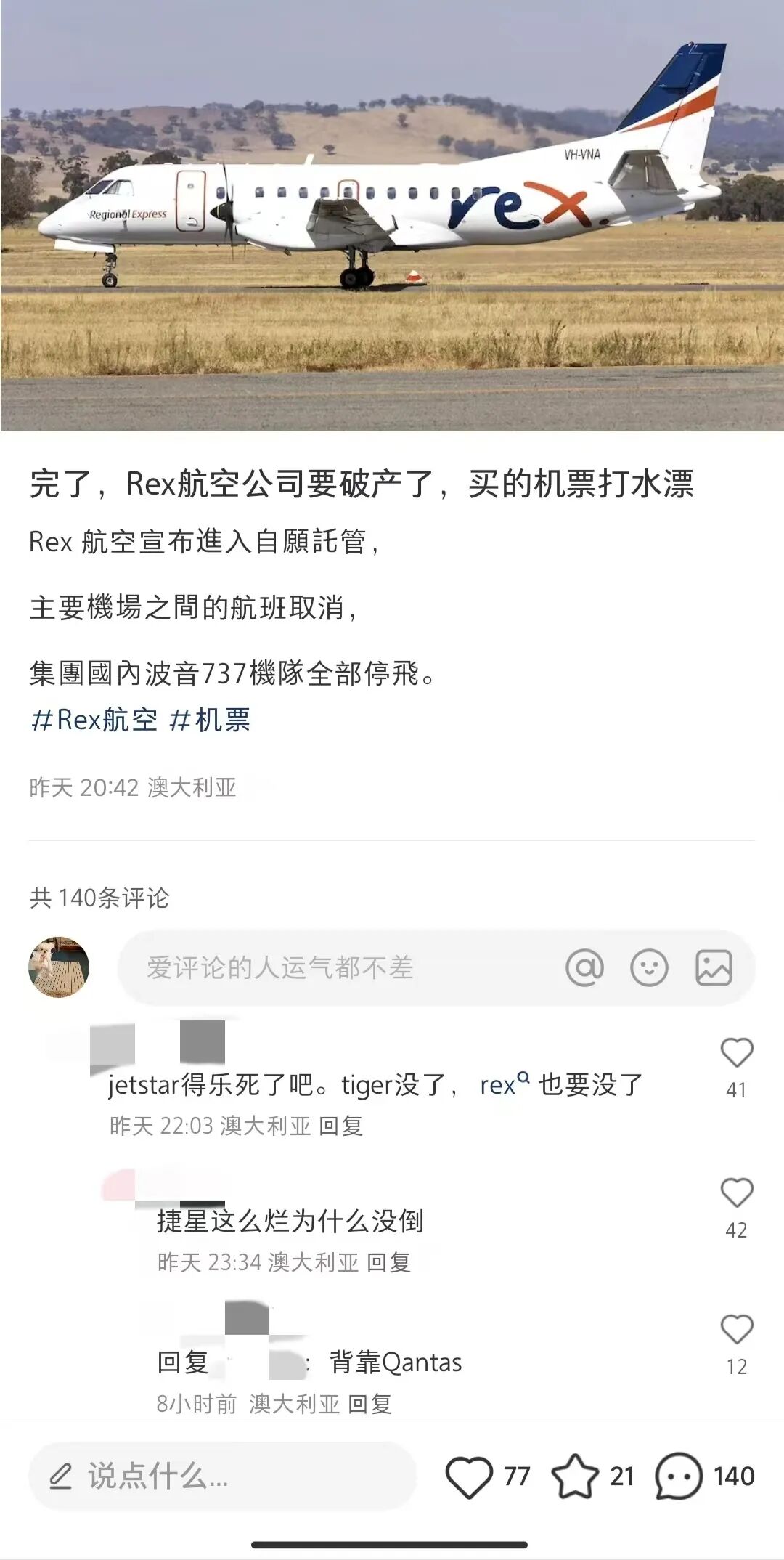 就在昨晚,Rex网站上发布的一份声明称,Regional Express Holdings Limited 及其 Rex 集团旗下的一些子公司已进入自愿托管状态,EY被任命为管理人。