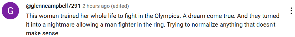 在这种情况下,没有真正的赢家。那位阿尔及利亚拳击手永远不会被视为值得的胜利者,而其他所有参赛选手也无法获得一场公平的比赛。所以,这有什么意义呢?我理解她想要拳击,这是她的运动,她也很擅长。不幸的是,在我看来,她的特殊情况确实应该将她排除在外。