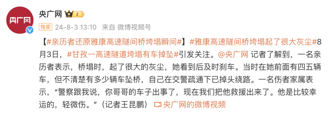 据央广网记者了解到,一名亲历者表示,桥塌时,起了很大的灰尘,她看到后及时刹车。当时在她前面有四五辆车,但不清楚有多少辆车坠桥,自己在交警疏通下已掉头绕路。
