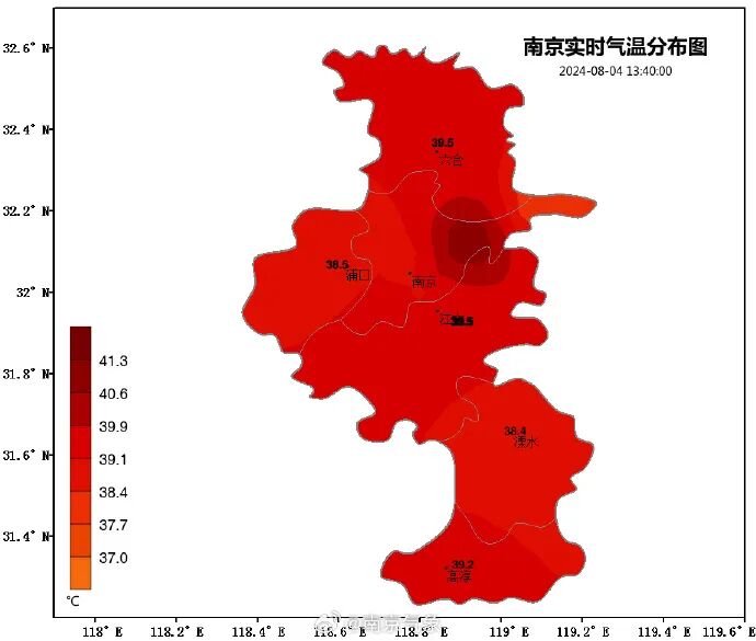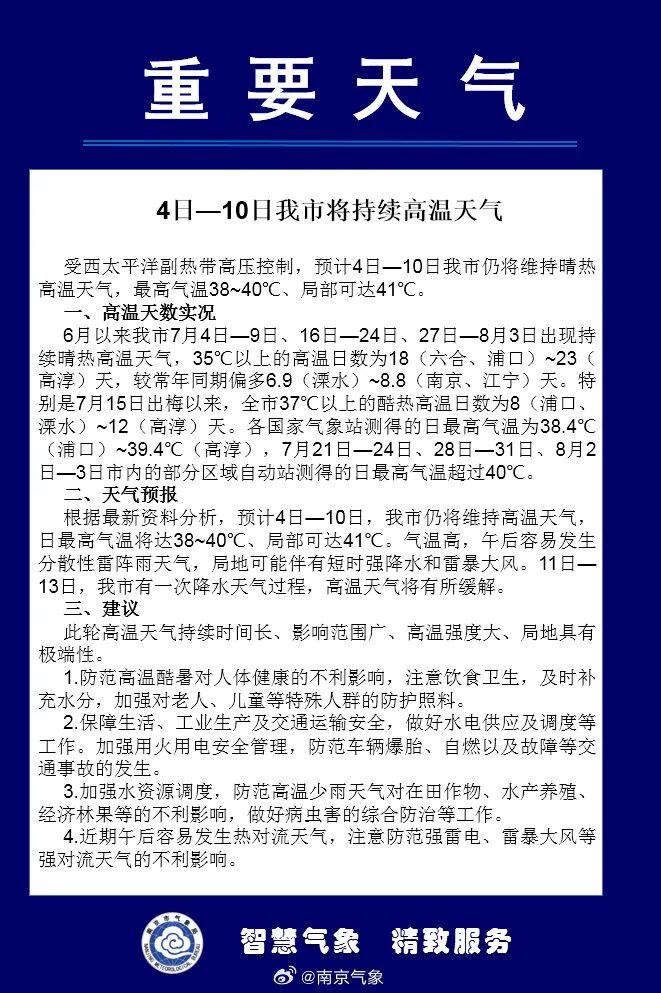 @南京气象 8月4日发布重要天气预报:受西太平洋副热带高压控制,预计8月4日到8月10日南京市将持续高温天气,最高气温38~40℃、局部可达41℃。