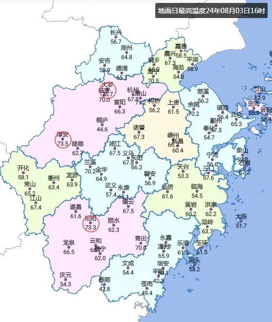 再来说地面温度,绝对是鞋底薄了直接烫脚的程度!截至昨日16时,杭州临安、淳安等区县地面温度超过70℃,最高的甚至达到75.7℃。