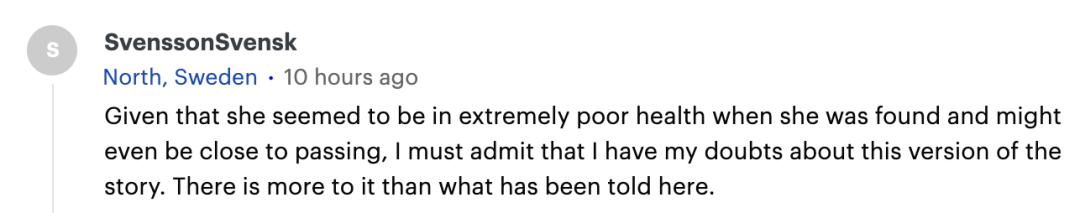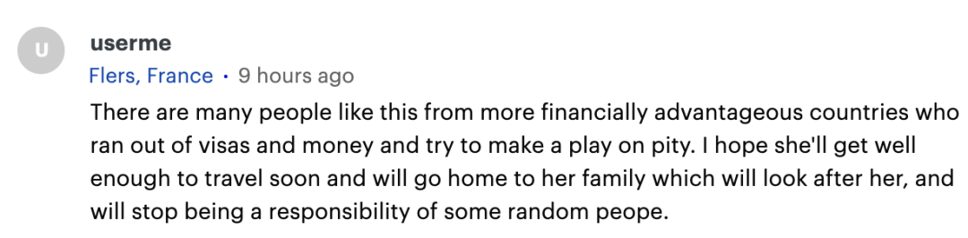 “很多来自经济条件较好的国家的人都和她一样,签证和钱都用光了,他们试图博取同情。我希望她能尽快康复,可以回家和家人团聚,家人会照顾她,不再是某个陌生人的责任。”
