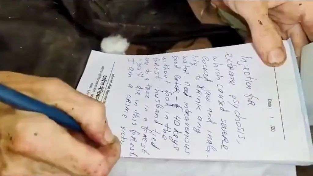 据医院内拍摄的现场视频显示,库马尔在警方讯问后,用笔在纸上写下了她的“证词”,“我的丈夫(前夫)把我铐在了原始森林的一棵大树上。”