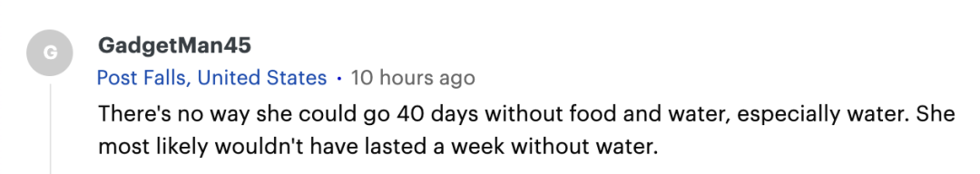 “她不可能 40 天不吃不喝,尤其是不喝水。不喝水的话,她很可能撑不过一个星期。”