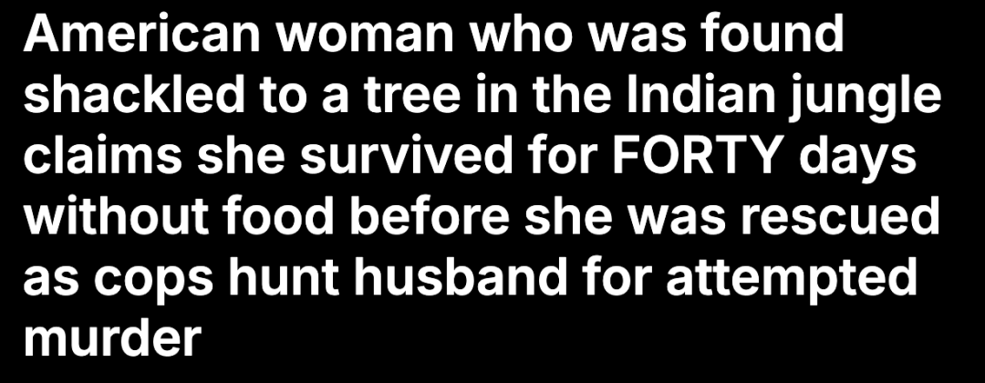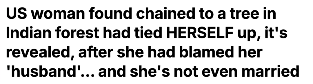 Daily Mail:美国女子被人铐在了印度原始森林的树上,声称她在没有食物的情况下活了40天,警方指控其丈夫谋杀未遂。