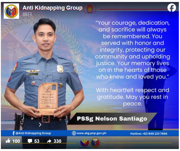 其中警察上士纳尔逊·圣地亚哥伤势过重,经抢救无效身亡,另一名警察总军士长伊登·阿卡德所幸只是轻伤。