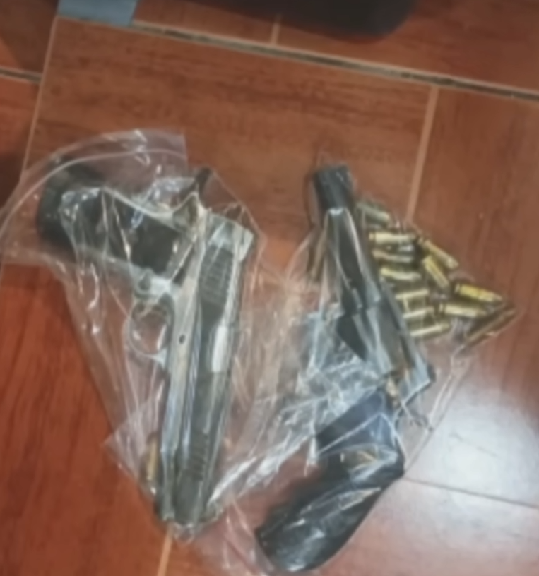 警方在现场搜获了两把手枪、毒品吸食工具以及多把开山刀等作案工具。