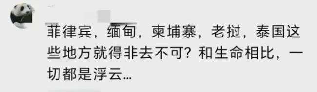 有网友严厉批评那些不顾安全警告,执意前往高风险地区的游客:“中国很多官方和民间网站一而再再而三地提醒非必要不要去东南亚的国家,尤其是泰国菲律宾缅甸这些国家,但还是有人当耳旁风。”