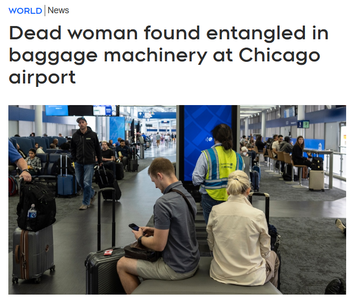 根据外媒最新报道,今天上午8点左右,美国芝加哥奥黑尔国际机场5号航站楼,一个行李处理区惊现女子尸体,工作人员发现之后被吓疯了,立马打电话求救。