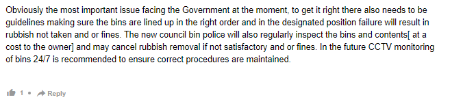 显然,这是政府目前面临的最重要问题,要做到这一点,还需要有指导方针,确保垃圾箱按正确的顺序排列在指定的位置,否则将导致垃圾不被收走和/或罚款。新的“市政垃圾警察”还将定期检查垃圾箱和内容(费用由所有者承担费用),如果不满意,可能会取消垃圾清理和/或罚款。未来建议,对垃圾箱进行 24/7 的闭路电视监控,以确保维护正确的程序。
