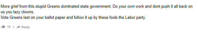 这个愚蠢的绿党主导的州政府会带来更多悲痛。你们这些懒惰的小丑,做好你们自己的工作,不要把一切都推到我们头上。在选票上把绿党放最后一位。