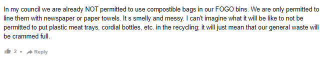 我们这边市议会规定,已经不允许在 FOGO 垃圾箱中使用可堆肥袋。我们只允许在垃圾箱内垫上报纸或纸巾。这样会很臭,很脏。我无法想象如果不允许将塑料肉盘、果汁瓶等放入回收箱会是什么样子;这只意味着我们的普通垃圾将被塞得满满的。