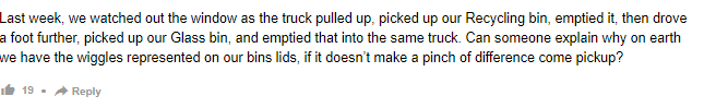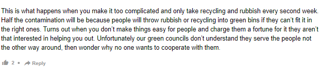 如果你把事情搞得太复杂,每两周才收一次垃圾和可回收物,就会发生这种情况。一半的污染是因为人们如果放不进合适的垃圾箱,就会把垃圾或可回收物扔进绿色垃圾箱。事实证明,如果你不让人们轻松处理事情,还要向他们收取一大笔钱,他们就不会那么愿意帮助你。不幸的是,我们的绿色委员会不明白他们为人民服务,而不是相反,然后想知道为什么没有人愿意与他们合作。