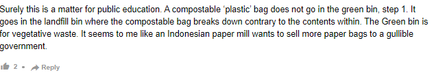 这当然是公众教育的问题。可堆肥的“塑料”袋不能放入绿色垃圾桶,这是第一步。它被放入垃圾填埋场,可堆肥袋会在那里分解。绿色垃圾桶用于植物废物。在我看来,这是印尼一家造纸厂想向一个容易上当的政府出售更多的纸袋。