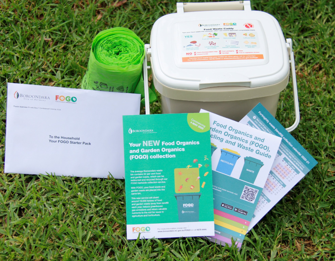 (Boroodara 市政府向居民发放的FOGO桶和可降解垃圾袋)