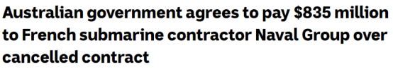 由于这次毁约,澳大利亚政府将向法国造船企业海军集团(Naval Group)支付8.35亿澳元的赔偿。