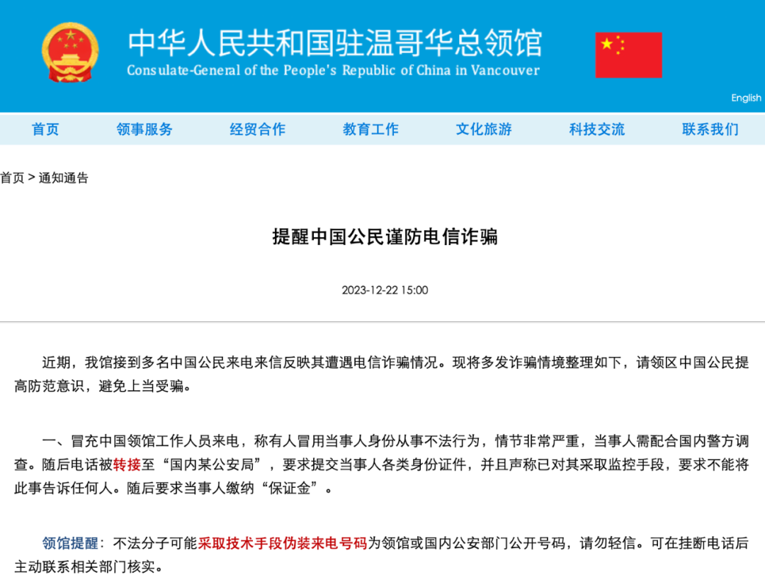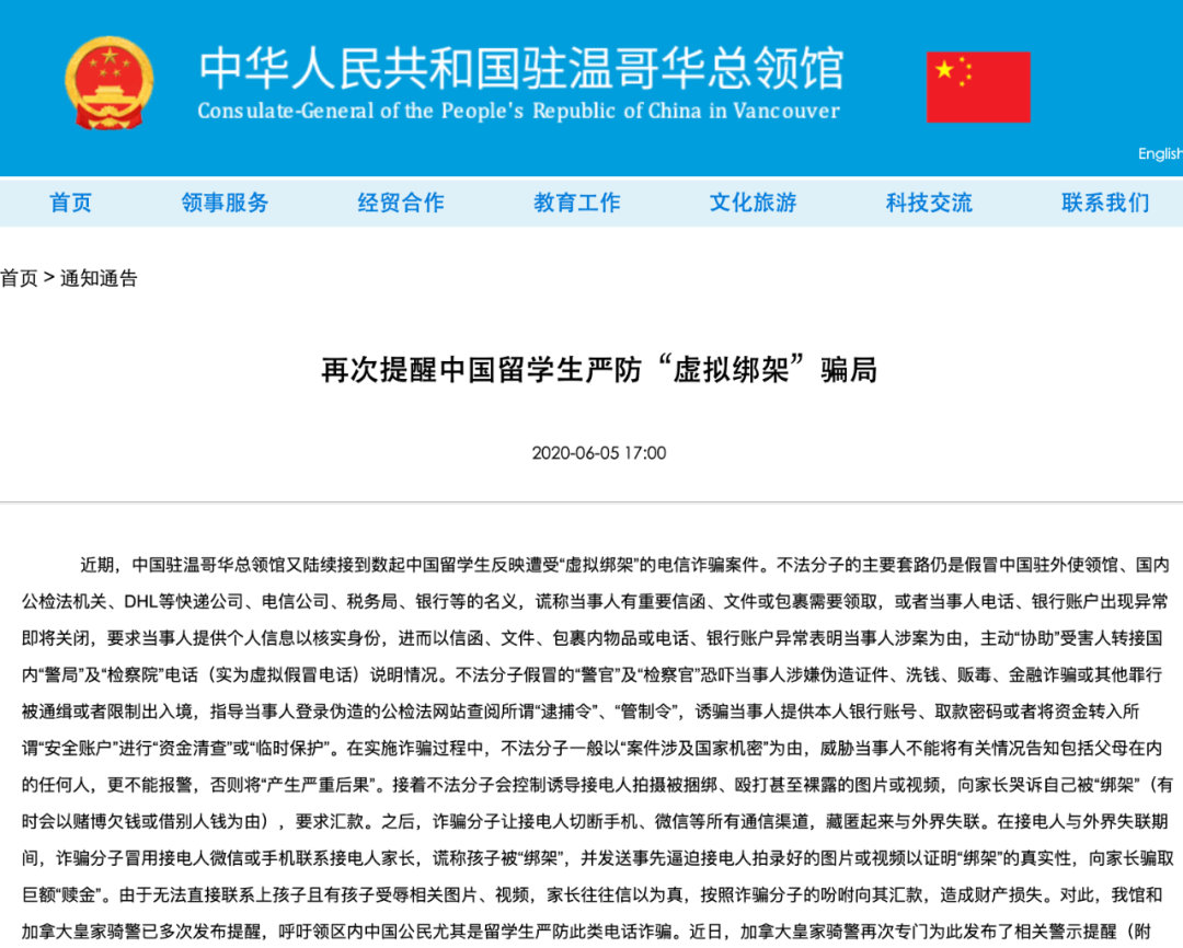 中华人民共和国驻温哥华总领馆在2020年6月5号曾发布一条《再次提醒中国留学生严防“虚拟绑架”骗局》,中国驻温哥华总领馆又陆续接到数起中国留学生反映遭受“虚拟绑架”的电信诈骗案件。不法分子的主要套路仍是假冒中国驻外使领馆、国内公检法机关、DHL等快递公司、电信公司、税务局、银行等的名义,谎称当事人有重要信函、文件或包裹需要领取,或者当事人电话、银行账户出现异常即将关闭,要求当事人提供个人信息以核实身份,进而以信函、文件、包裹内物品或电话、银行账户异常表明当事人涉案为由,主动“协助”受害人转接国内“警局”及“检察院”电话(实为虚拟假冒电话)说明情况。不法分子假冒的“警官”及“检察官”恐吓当事人涉嫌伪造证件、洗钱、贩毒、金融诈骗或其他罪行被通缉或者限制出入境,指导当事人登录伪造的公检法网站查阅所谓“逮捕令”、“管制令”,诱骗当事人提供本人银行账号、取款密码或者将资金转入所谓“安全账户”进行“资金清查”或“临时保护”。