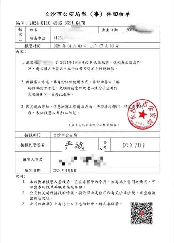 做完笔录后,“严警察”发给林野一张带有“长沙市公安局”印章的回执单,右下角还有“我的长沙”App的二维码。并告诫林野,盗用信息的人可能会做更多坏事,警方将继续追查线索。