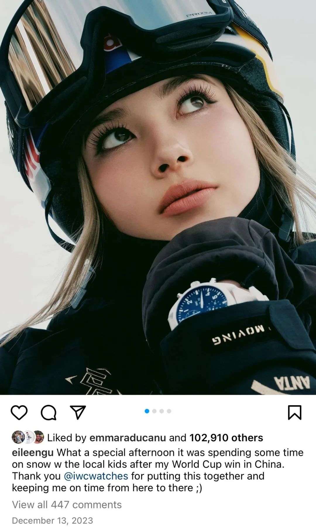 谷爱凌第一时间在ins上向他发去了祝贺,并留言:incredible(难以置信)。