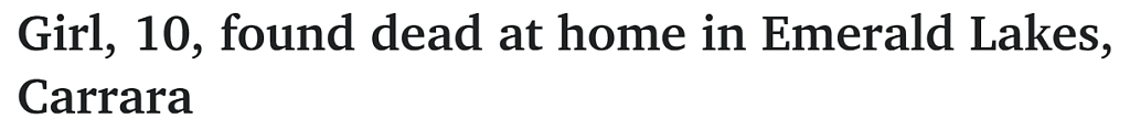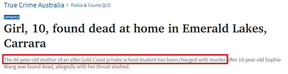随后,经过调查,该女子是死者王某的妈妈徐某(Yingying Xu),她亲手杀害了自己年仅10岁的可爱女儿。徐某本人并没有出现在法庭上。她目前正在被还押候审,将于11月29日再次出庭,警方被要求在11月8日前提交案情摘要。邻居特雷西·多诺万 (Tracey Donovan) 说,案发房屋居住着一对夫妇和他们的小女儿。她描述说,她看到了她认为是父亲的人,当时他被带到犯罪现场的一辆救护车上。“我刚刚听到他大叫,这是我听过的最可怕的声音。那是一种言语无法解释的哭声——令人难以忘怀。”据多诺万透露,儿童保护和调查部门的侦探深夜一直在犯罪现场与邻居交谈。她说,这个家庭安静而友好——人们经常看到他们的女儿和其他孩子在街上玩耍。“发生这样的事情真是一场悲剧。我想整条街都会感受到这一点——就在离家这么近的地方。”另一名邻居表示,此事令她倍感震惊,社区一般很宁静,“这里通常很安静,真不敢相信居然会发生这种事。”当地一名女子表示,得知发生这种事,她都睡不着觉了,“这太可怕了,真是令人沮丧。”该女子称,几年前,她自已因病失去了一个孩子,她说她很能理解这名女孩家属的心情,“失去孩子是世界上最糟糕的事情。”当地居民在昨日晚间自发在Facebook页面上表达他们的哀悼之情,一名居民发帖称,“我住在这条路上,简直不敢相信,我的心与这个家庭同在,难以想象他们会有多难过。安息吧,小天使。”另一名居民则在Instagram上发帖表示,“事情发生在我的社区,这是我的邻居,我哭了,真是太令人震惊了。这个世界到底怎么了!安息吧,天使。”这名女孩就读于附近的Emmanuel College,校长丹·布朗(Dan Brown)于周三上午向学校社区发出了一封信。信中说:“我怀着沉重的心情向大家通报昨晚在Emerald Lakes的一栋房屋中发生的悲惨事件,我们敬爱的一名学生去世。我们对这一事件感到背上,并知道这将对我们的学校社区产生深远的影响。我们为孩子的家人和朋友祈祷,并向所有受这场悲剧影响的人致以最深切的哀悼。”布朗在信中还表示,Emmanuel College和Josiah College将派出一支咨询人员团队来支持悲伤的学生。“我们的首要任务是学生和教职员工的福祉,我们将在未来几天竭尽全力帮助我们的社区。请放心,我们为社区中的所有人——学生、教职员工和家长提供支持,任何有需要的人都可以获得这些支持服务。虽然言语无法减轻如此悲惨损失的震惊和痛苦,但请知道,我们的思念和祈祷与你们所有人同在。”据悉,Emmanuel College的学费高昂,10至12年级学生的学费高达 13,000澳元。最近获得奥运会金牌的游泳运动员卡梅伦麦克沃伊 (Cameron McEvoy) 就是该学院的校友之一。该校拥有著名的体育项目,运动表现负责人大卫·里德(David Reid)最近还作为澳大利亚接力队教练参加了巴黎奥运会。报道称,目前,昆州警察局尚未正式确认该事件是否正在作为涉嫌家庭暴力杀人案进行调查。澳大利亚的家庭谋杀案件屡见不鲜,就在今年7月,悉尼才刚刚发生过一起骇人听闻的父亲杀子惨案。今年7月,警方指控一名28岁的父亲将家人困在房屋中纵火行凶,最终烧死了自己的3个孩子。7月7日凌晨1点左右,悉尼西区莱洛园(Lalor Park)的一栋房屋被点燃,澳洲一名父亲因将7名孩子和他们的母亲锁在屋内,然后放火烧屋。一家9口人被困在火场,最终导致两名年龄分别是3岁和6岁的男孩和一名5个月大的女婴死亡。警方补充,其他4名孩童仍在医院接受治疗,情况稳定,他们29岁的母亲经治疗后已经出院。28岁的父亲因烧伤和吸入浓烟而被送入韦斯敏医院(Westmead Hospital)救治,期间一直昏迷。他苏醒后,警方指控他三项谋杀罪、五项企图谋杀罪和一项蓄意破坏财产并意图危害他人生命。火灾期间,住在这栋房屋对面的的霍金斯(Jarrod Hawkins)撞开锁住的门,救出了一名9岁女孩,三个年龄分别为4岁、7岁和11岁的男孩,以及他们的母亲。他称,该名父亲阻止他拯救一名11岁男童,“他们的爸爸想杀了我们。”