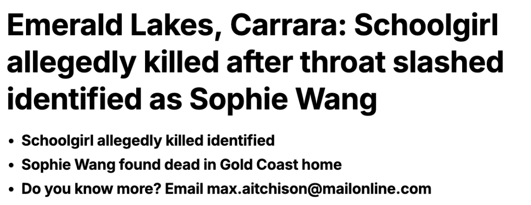 据《Daily Mail》报道,就在昨天晚上6点左右,昆州黄金海岸发生了一起命案,1名年仅10岁的华人女孩王某(Sophie Wang)在家中被割喉而亡。