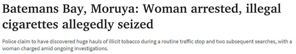 此外,在周三下午2点38分左右,南海岸警方搜查了Batemans Bay的一个仓储设施,据称在那里发现并查获了17.8万支非法香烟,估计黑市价为26.7万澳元。