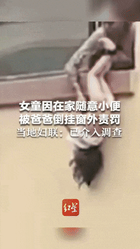 视频中,一名男子拎着一个女童的脚脖子,将孩子倒挂在窗外大声训斥: