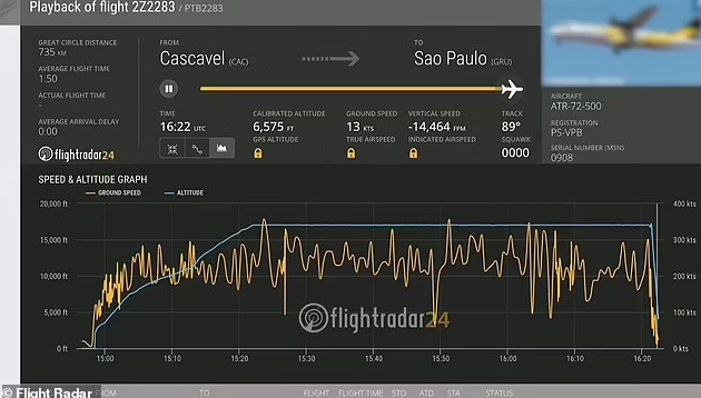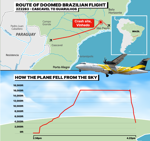这架飞机是当地 Voepass 航空公司的 ATR-72 涡轮螺旋桨飞机,当时正从南部巴拉那州的卡斯卡韦尔飞往圣保罗,于当地时间下午 1:30 左右在 Vinhedo 镇坠毁。