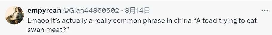 “笑死,这其实源自中文里一句俗语:‘癞蛤蟆想吃天鹅肉?’”