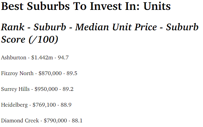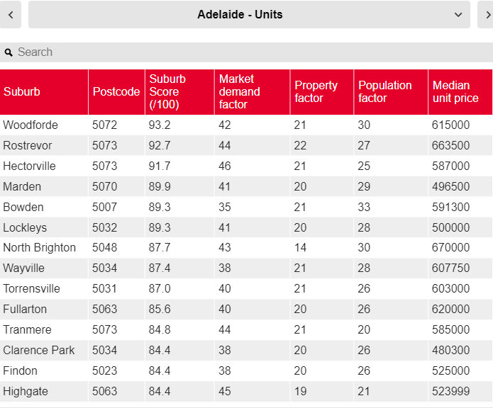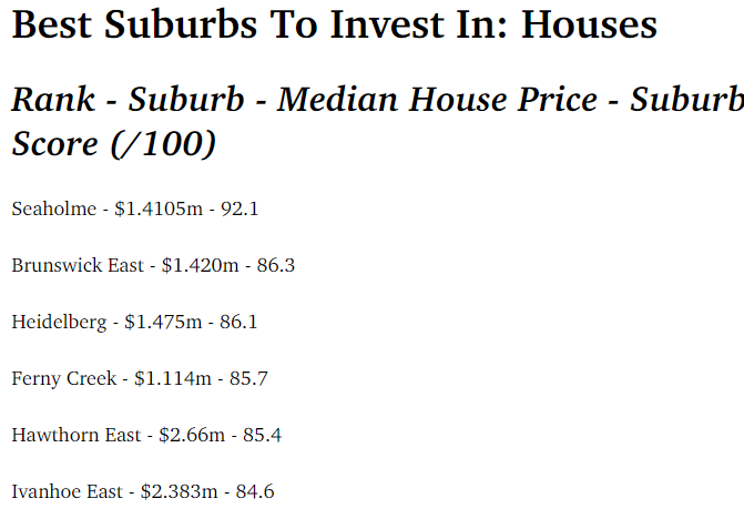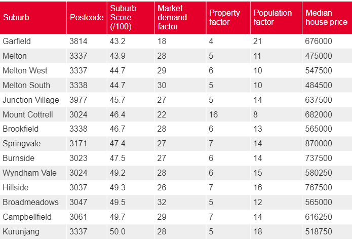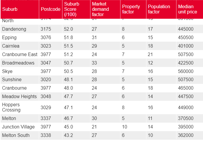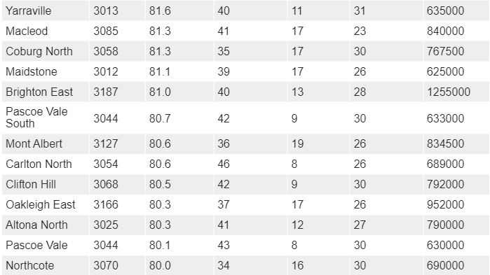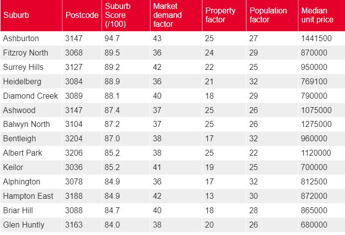 Finder通过对墨尔本超过500个郊区和地区进行综合分析,考量了市场需求、人口增长趋势及历史价格数据,为每个区域打出了最高100分的评分。