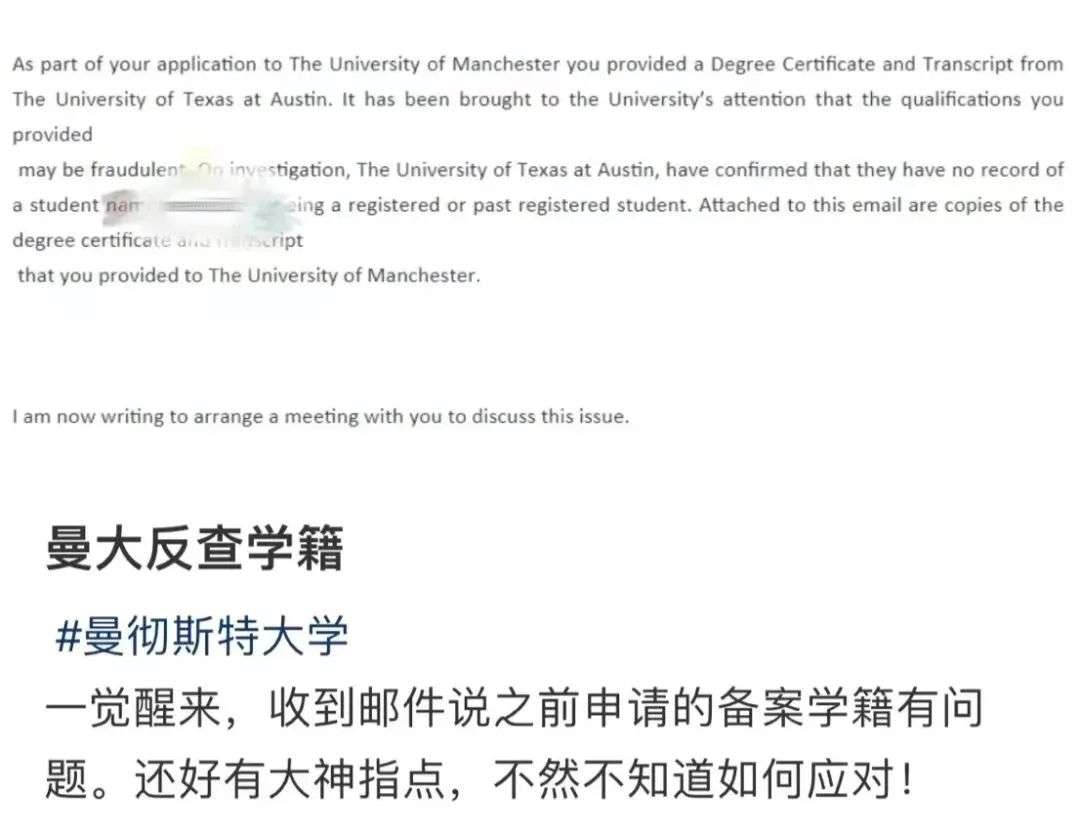 首先“暴雷”的是曼彻斯特大学。从校方的邮件中可以清晰的看到,学校方面认为该学生之前备案学籍有问题,也就是申请入学的时候涉嫌虚假资料,那么如果不进行佐证,就会直接撤回offer。