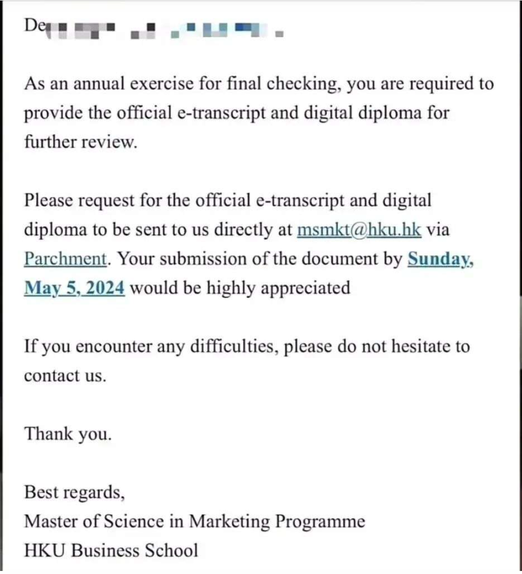 今年5月,正值毕业论文冲刺阶段,香港大学法学院的学生NANA收到了来自学院行政部发出的邮件,要求其两周内把英国硕士学位证书和成绩单原件交到行政办公室。