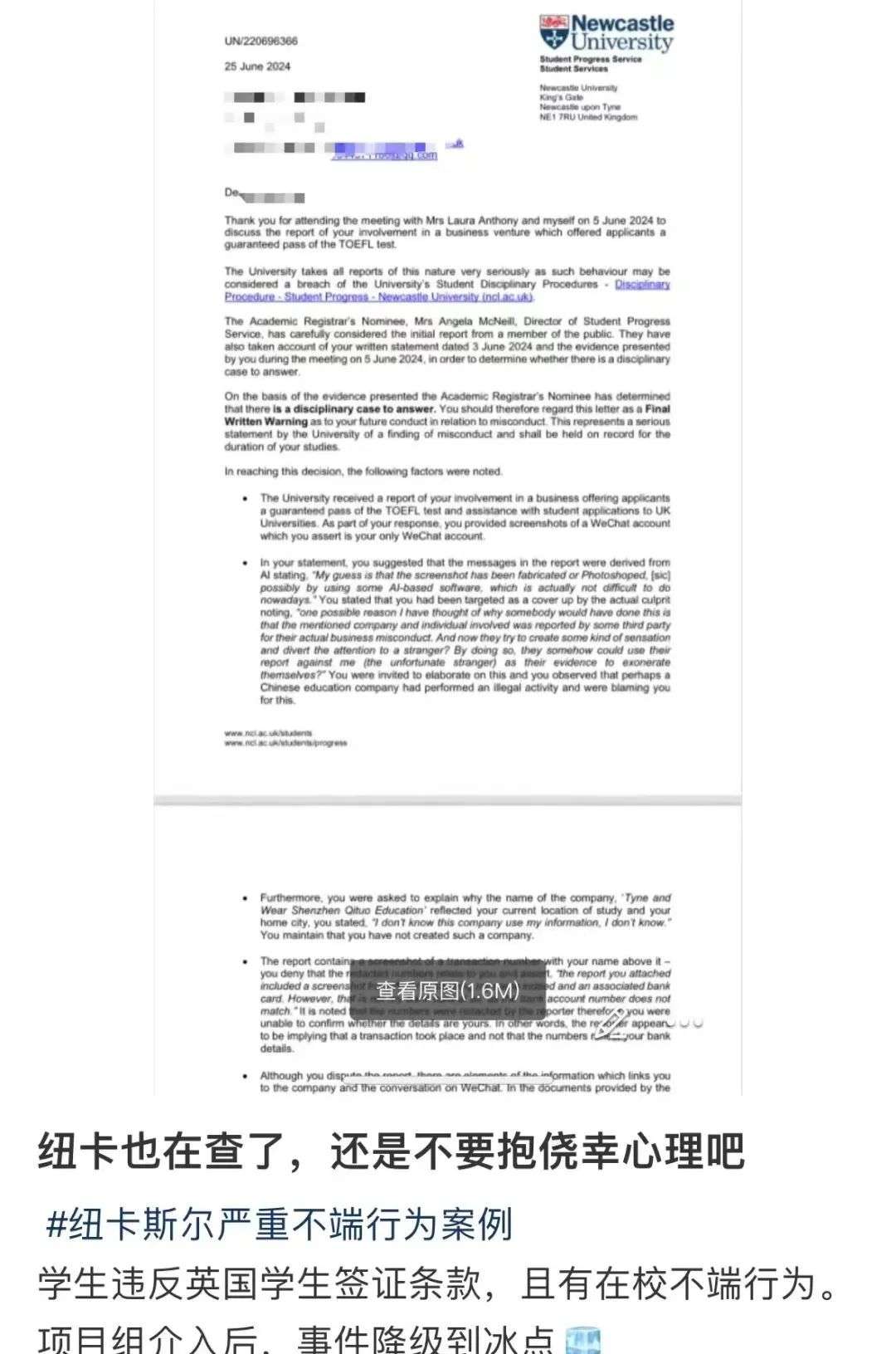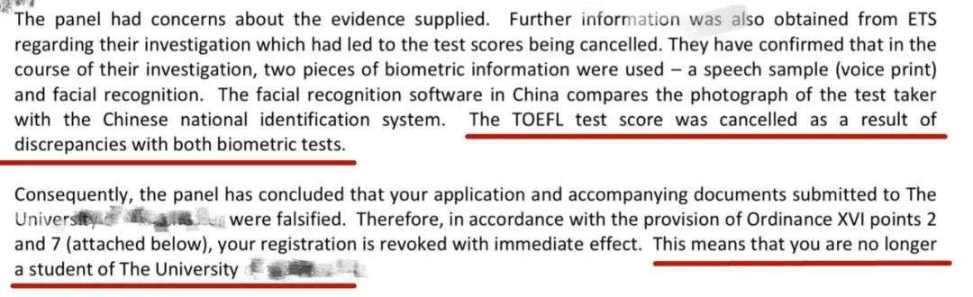 4万元打过去后,她也顺利的进入到了自己梦想的英国大学,期间她努力学习,还没有毕业就已经获得了腾讯校招的offer。正在规划自己美好未来的她早已把当年花钱替考的事情忘得一干二净,直到今年7月学校给她发来了一封开除信,表示经过和托福官方回查,确认了小A是替考的。