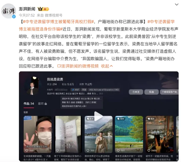 然而虚荣心作祟下,他编织出逆袭留学的经历博取流量,以获取利益。