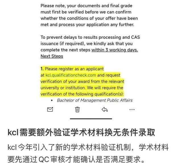 而为了在入学前就杜绝这样的情况,今年KCL直接引入了新的学术资料验证机制,学术资料必须通过QC审核才能确认是否满足要求。