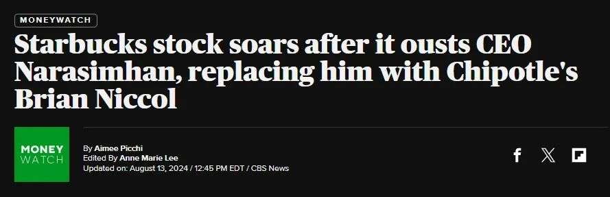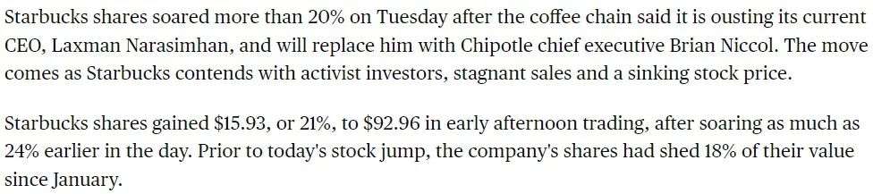 拉克斯曼的“被离职”让他不幸成为了星巴克史上最短命的CEO...更尴尬的是,在他官宣离职+新人官宣入职的同一天,星巴克的股价飙升了20%...