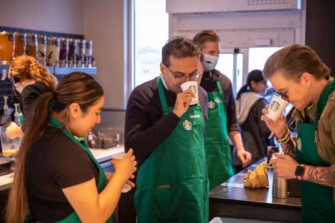拉克斯曼于 2022 年 9 月被任命为首席执行官,但直到 2023 年 3 月才接替舒尔茨。在这几个月里,他巡视了多家咖啡馆,经常穿着绿色围裙在柜台后面工作,还学习制作了一些饮品。