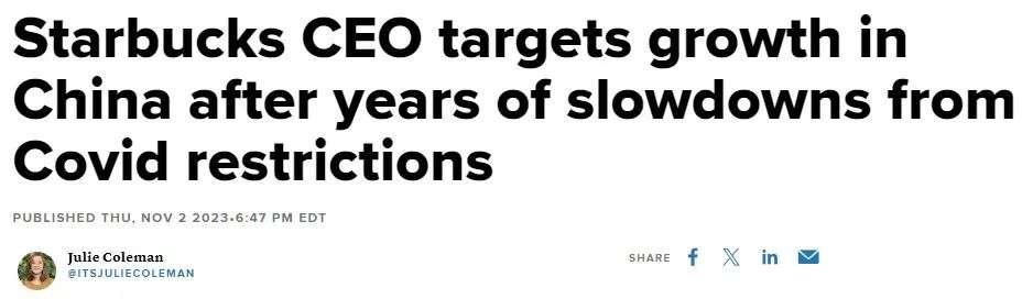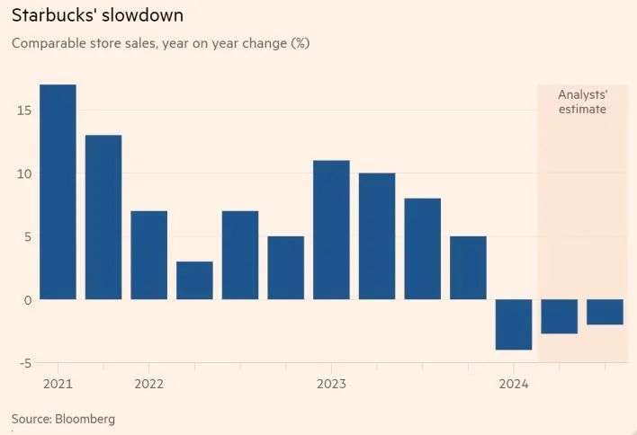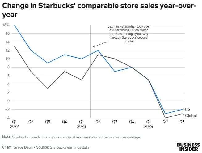 今年7月底,星巴克公布本季度全球同店销售额下降 3%,而去年同期该数字增长了 10%。