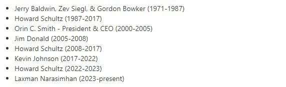从1971年品牌建立以来,星巴克一共出了8位CEO,初始的三位创始人Jerry Baldwin, Zev Siegl, & Gordon Bowker,在这个职位上做了16年。