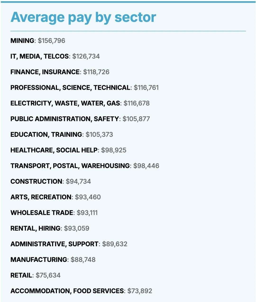 其中,收入最高的行业为采矿业,平均年薪为156796澳元。