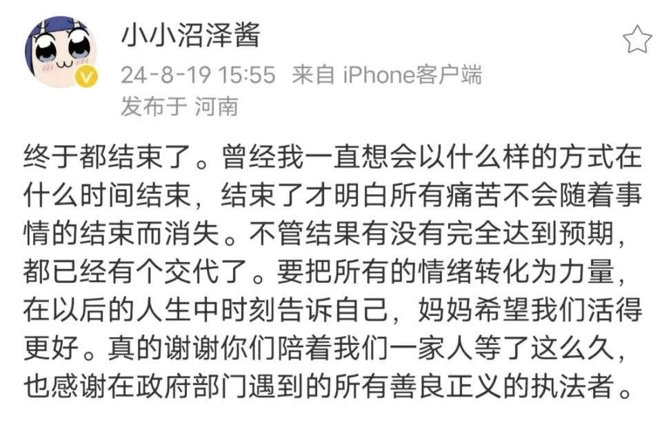 8月19日下午,小王发微博表达了自己的感受:“终于都结束了。曾经我一直想会以什么样的方式在什么时间结束,结束了才明白所有痛苦不会随着事情的结束而消失。不管结果有没有完全达到预期,都已经有个交代了。”