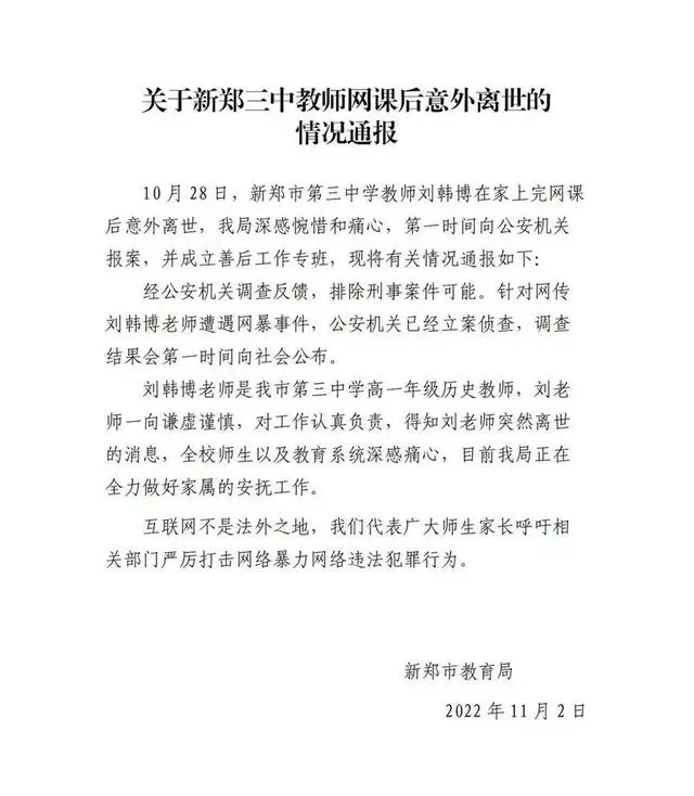 2022年11月2日,新郑市教育局针对此事发布情况通报称公安机关已立案侦查,调查结果会第一时间向社会公布。