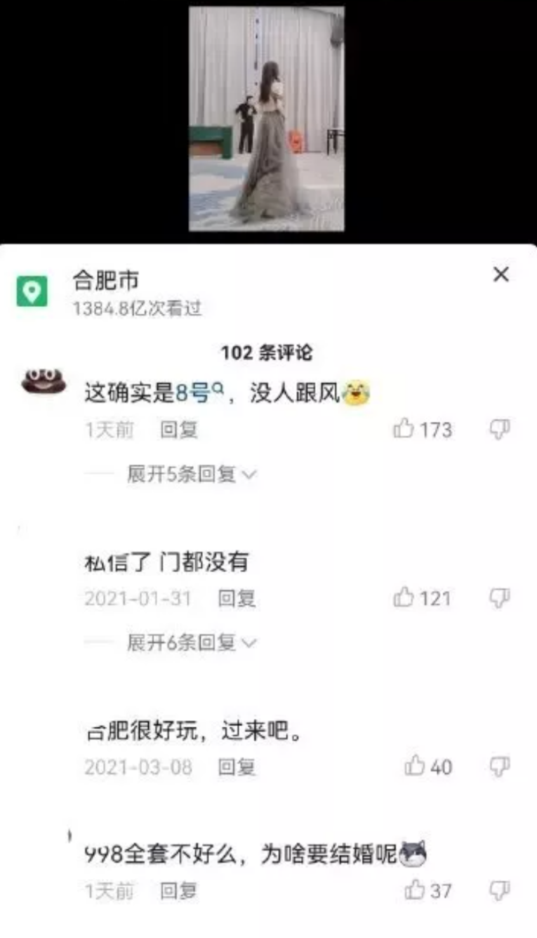 还有合肥那位女博主,不就是在短视频号上分享一下自己在订婚宴上的幸福,然后留言区里,她就成了所谓的「8号技师」。