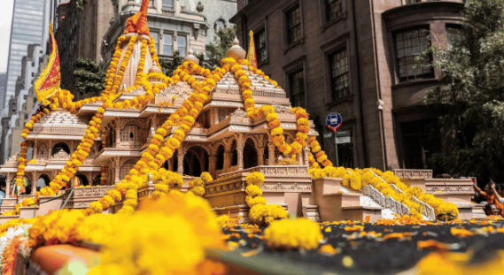最吸引人的是阿约提亚罗摩神庙的木制复制品,它长18英尺,宽9英尺,高8英尺,大部分是在印度雕刻的,并通过空运运输来参加印度日游行的活动。