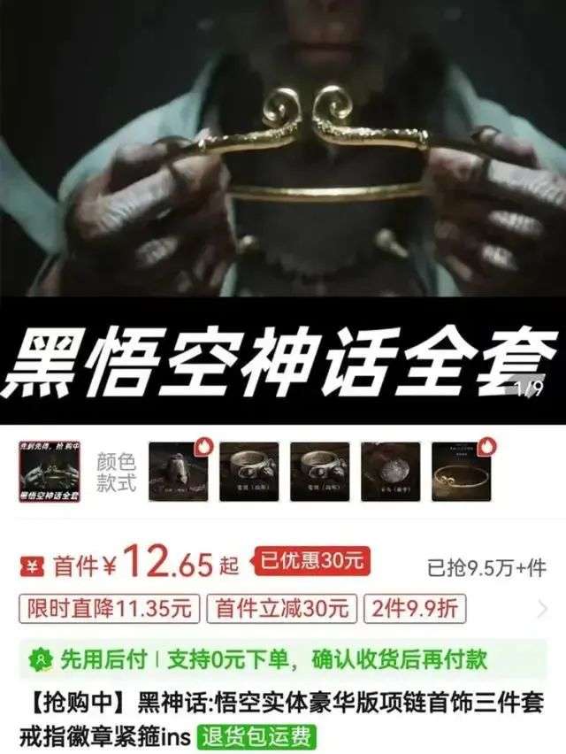 在拼多多一家店铺内,名称为“黑神话:悟空实体豪华版项链首饰三件套戒指徽章紧箍ins”的商品售卖显示已被抢购9.5万+件。
