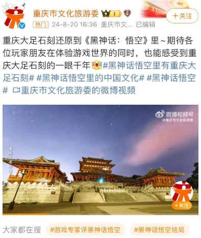 目前《黑神话:悟空》的取景地山西、重庆、襄阳、阆中等多地文旅已借势展开传播。